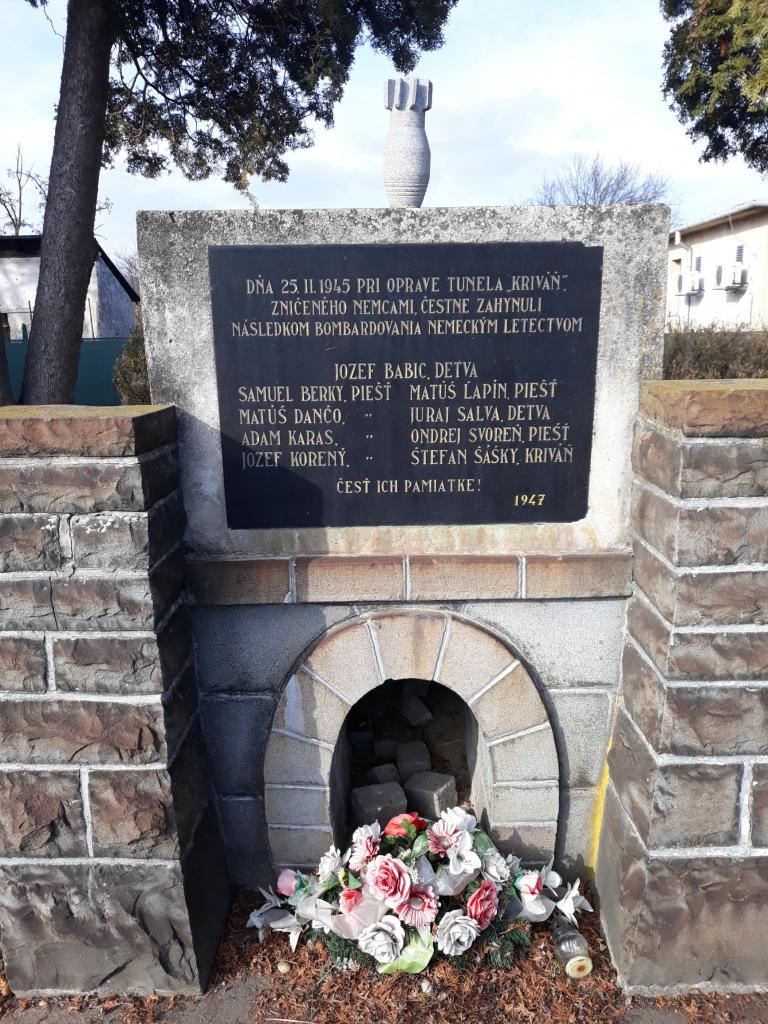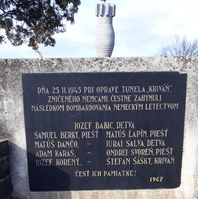 Dňa 25. februára 2019 sme si pripomenuli 74. výročie bombardovania Krivánskeho tunela na železnici. Bolo to obdobie, keď postupujúcemu oslobodzovaciemu vojsku bolo z nemeckej strany zabránené pokračovať ďalej do vnútrozemia po železničnej trati. Zahynulo pri ňom 9 mužov a okrem nich dve ženy v blízkom dome. Pripomína nám to pamätník pri železničnej stanici v Kriváni, kde sme sa poklonili ich pamiatke.